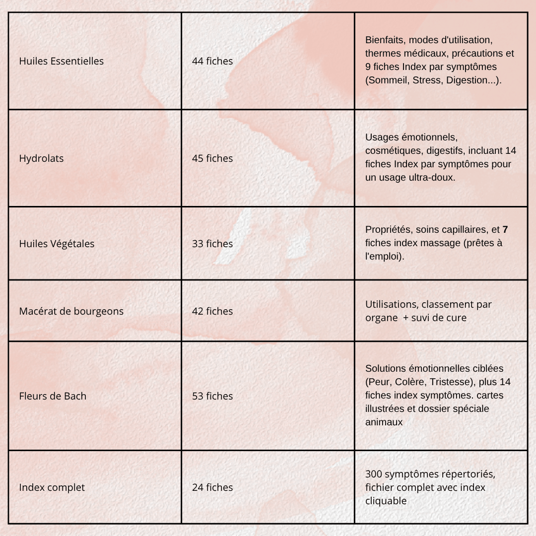 Grâce à l'index complet inclus, vous pouvez identifier instantanément la fiche dont vous avez besoin. Que vous préfériez les Huiles Essentielles pour leur puissance ou les Hydrolats pour leur douceur, l'index vous guide directement vers le bon remède pour plus de 300 maux et situations.